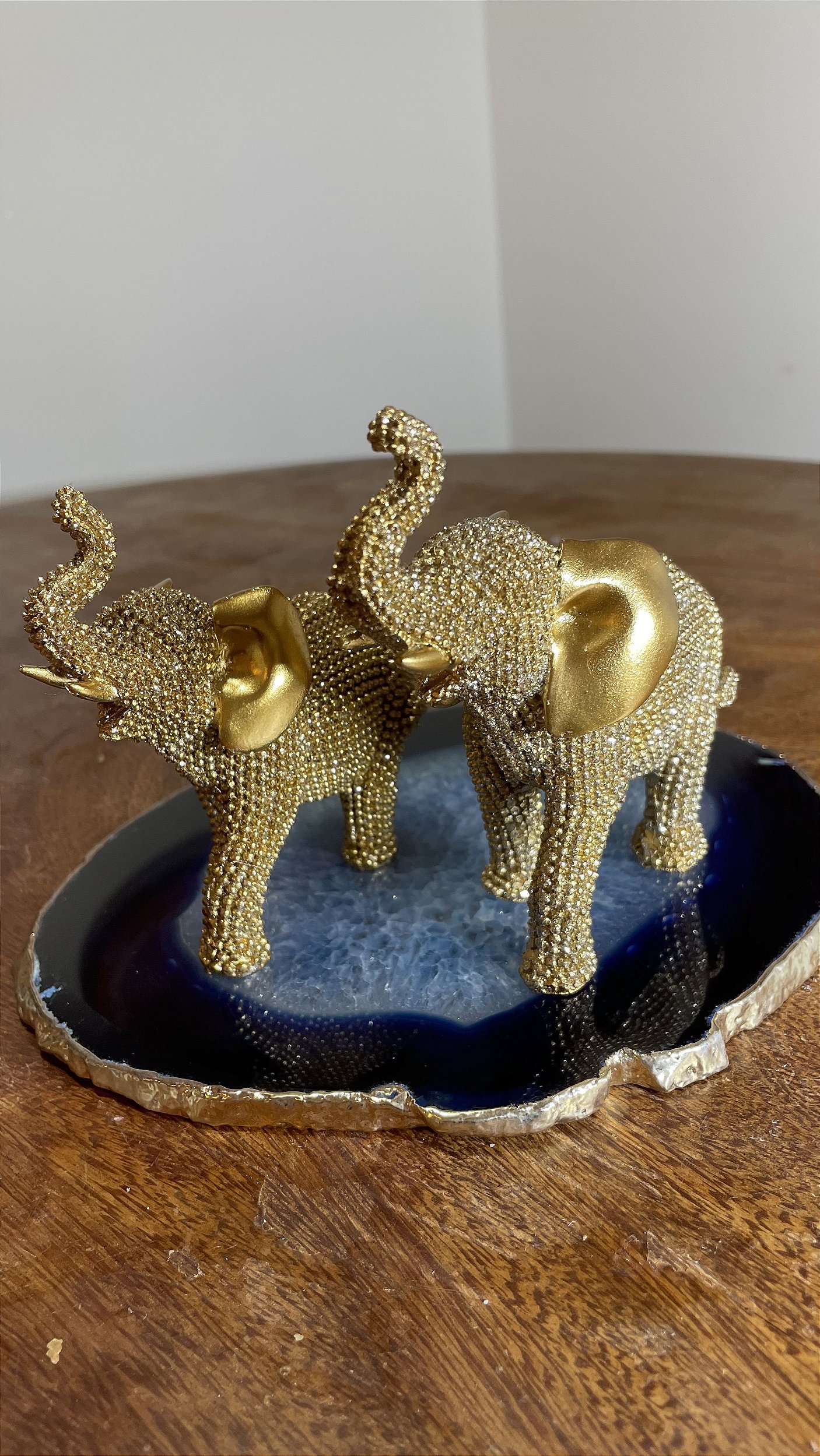 Elefantes ponto de luz dourado diretamente da Índia, em bandeja de pedra 100% Natural Ágata azul. Trazendo harmonia e prosperidade para o ambiente.